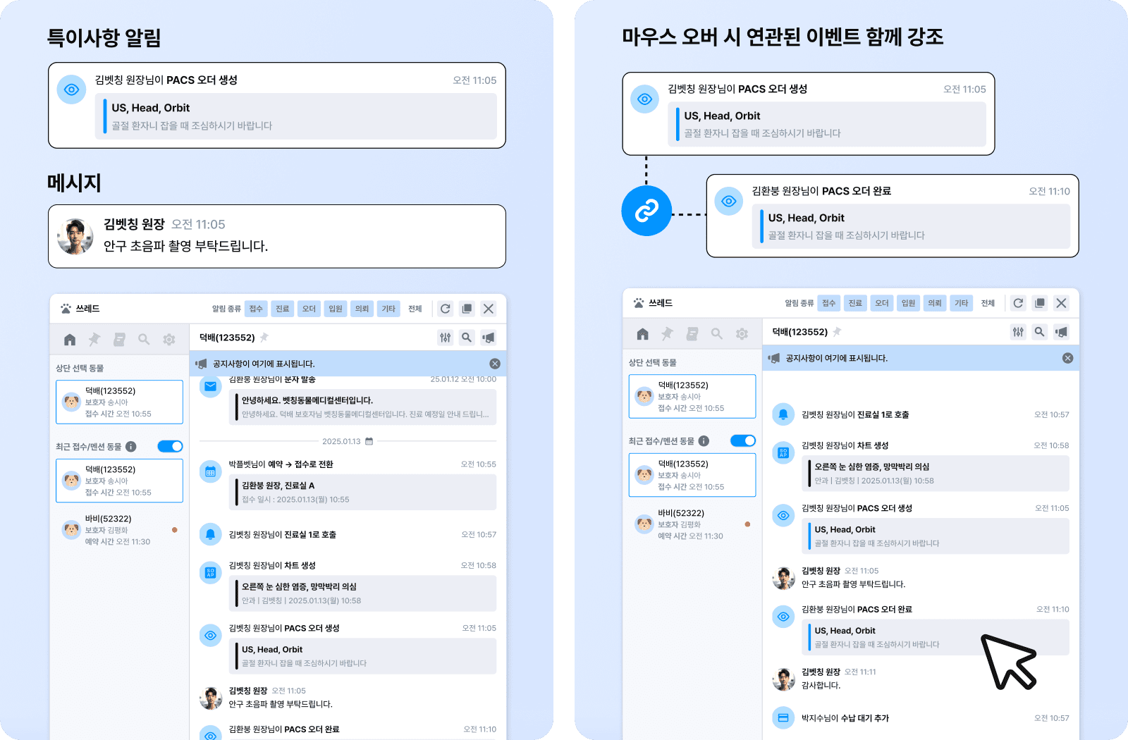 쓰레드 기능도 있습니다. 환자 중심으로 진료 기록을 타임라인 형태로 볼 수 있어서, 차트 여러 곳을 넘나들지 않고 해당 환자의 흐름을 한 화면에서 파악할 수 있습니다.