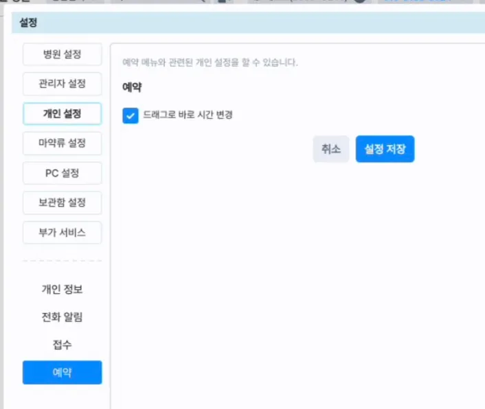 드래그로 바로 시간 변경 설정이 개인설정에 추가되어, 예약 일정 이동 시 즉시 변경 또는 확인 후 변경을 선택할 수 있습니다.