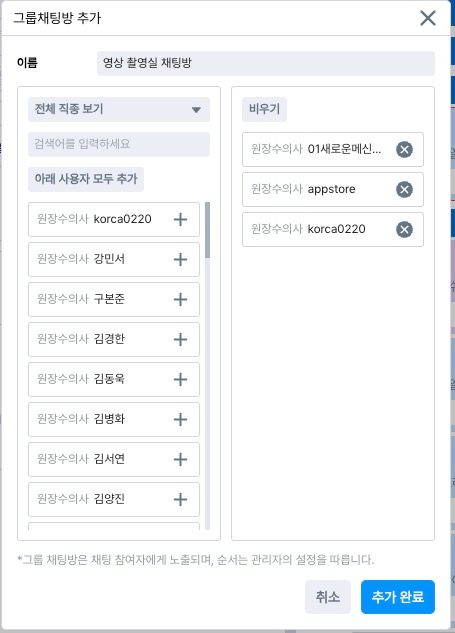 그룹 채팅방의 생성, 수정이 가능하며 채팅방 이름과 참여자를 자유롭게 관리할 수 있어요. 그룹 채팅방 표시 순서도 조정할 수 있어 병원 조직 구조나 업무 우선순위에 맞춘 소통 환경을 구성할 수 있어요.
