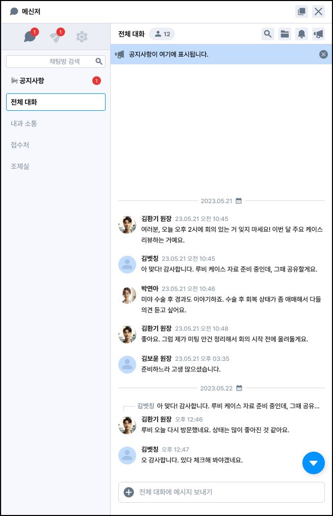 메시지에 마우스를 올리면 공지사항 설정 버튼이 나타나며, 중요한 메시지를 공지로 고정할 수 있어요.