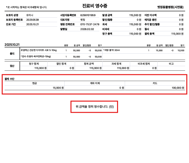 병원 날인 양식의 위치가 결제 정보 하단으로 변경되었습니다.