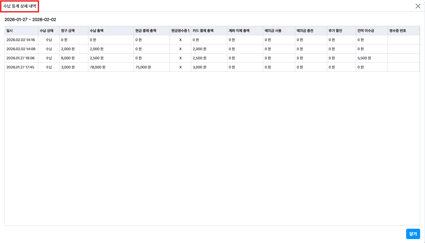 이제 수납 통계 결과를 더블클릭하면 해당 기간의 상세 수납내역을 확인할 수 있습니다.