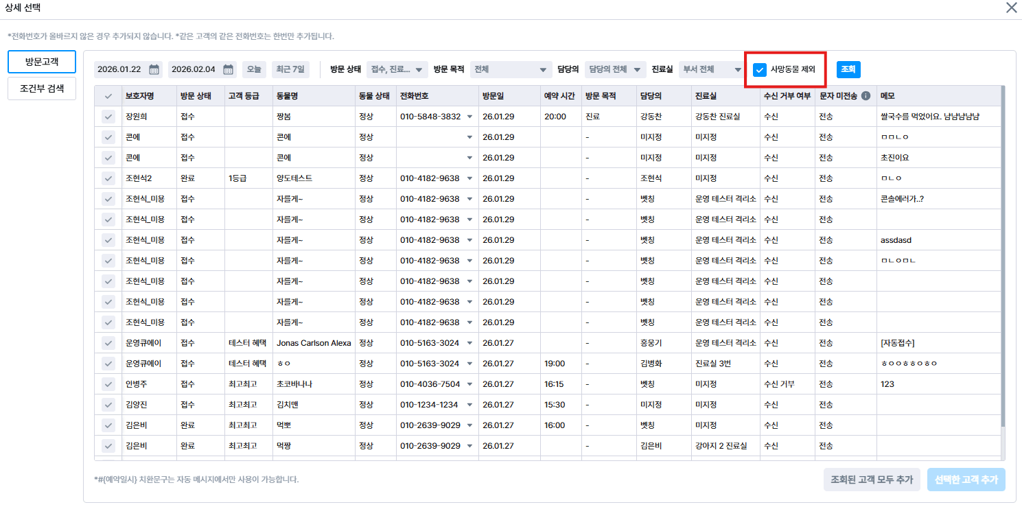 상세선택/방문고객 메뉴에서 사망동물과 연관된 방문을 제외할 수 있는 필터 버튼이 추가되었어요.