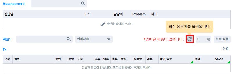 해당 버튼 클릭 시 동물의 최신 몸무게 정보를 불러오며, Rx코드 중 몸무게에 영향을 받는 값들을 자동으로 재계산해요. 정확한 용량 계산으로 처방 오류를 예방할 수 있어요.
