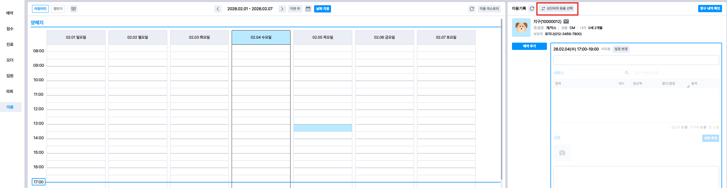 우측 미용기록 영역에 '상단바의 동물 선택' 버튼을 추가했어요.