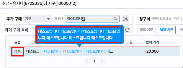 추가 구매 용품 검색 시 용품 코드의 이름이 긴 경우, 커서를 올렸을 때 툴팁으로 전체 이름을 확인할 수 있게 변경했어요.