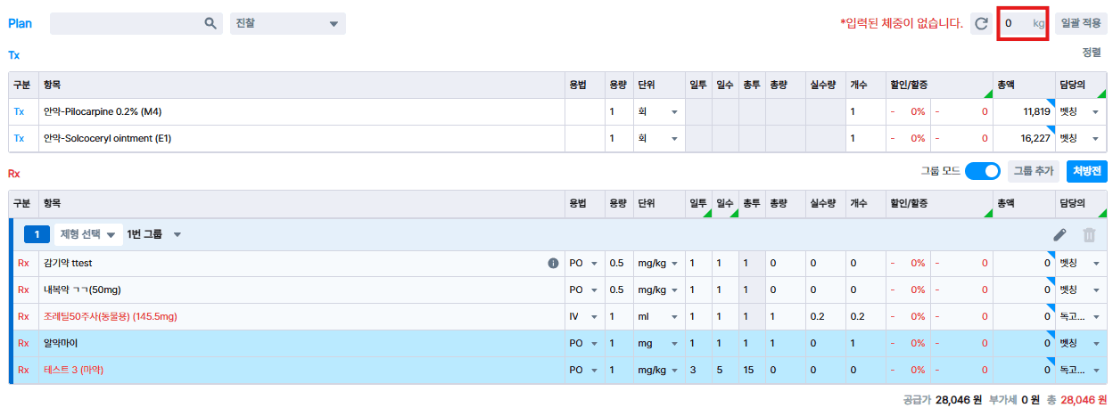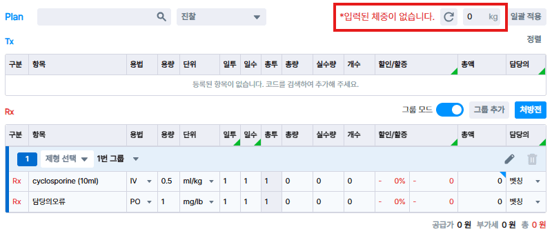 차트의 체중값이 0으로 설정되어 있어도 약물 처방을 진행하실 수 있어요.
