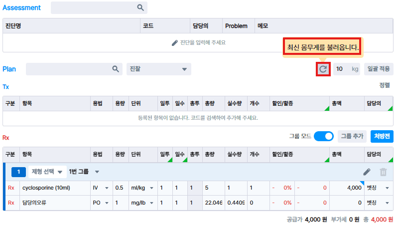 차트 체중값이 0인 상태에서 체중 기반 약물 처방 가능하며, Plan 옆 새로고침 버튼을 클릭 시 최신 Vital 체중값을 자동으로 불러와요.