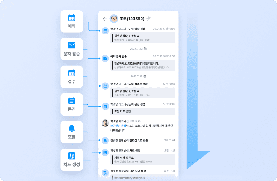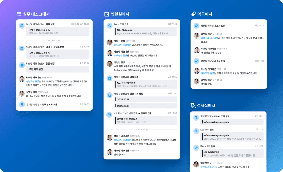 교대할 때 구구절절 메모를 남길 필요가 없어요. 다음 근무자는 해당 환자의 쓰레드 타임라인만 쓱 훑어보면 '아, 주간에 이런 처치가 있었고, 보호자님이 이런 문의를 하셨구나' 하고 파악이 끝납니다. 기억에 의존하지 말고 데이터(기록)에 맡기세요.