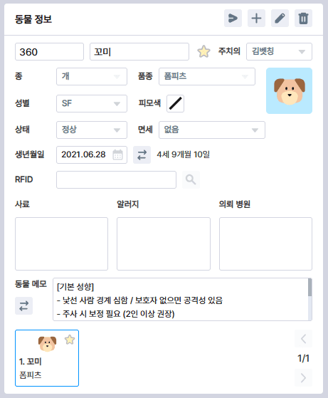 클라우드 동물병원 차트 플러스벳의 동물 메모