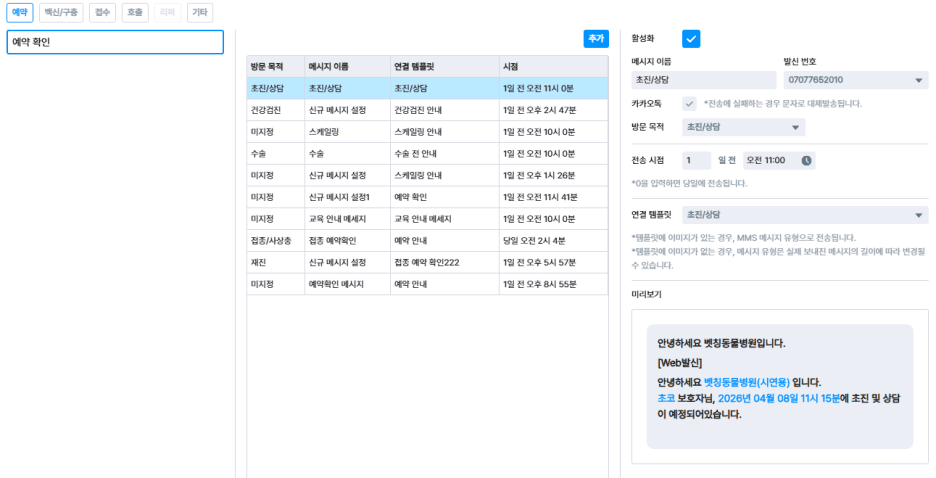 하지만 동물차트 플러스벳은 예약 안내, 진료 관련 알림 등 우리 동물병원 운영 흐름에 맞춰 문자 및 알림톡 발송을 설정해 활용할 수 있습니다.