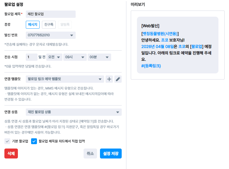 이를 통해 전화 안내 없이도 재방문 관리가 가능해지며, 동물병원 스태프의 아웃바운드 업무 부담을 줄이는 데 도움이 됩니다.