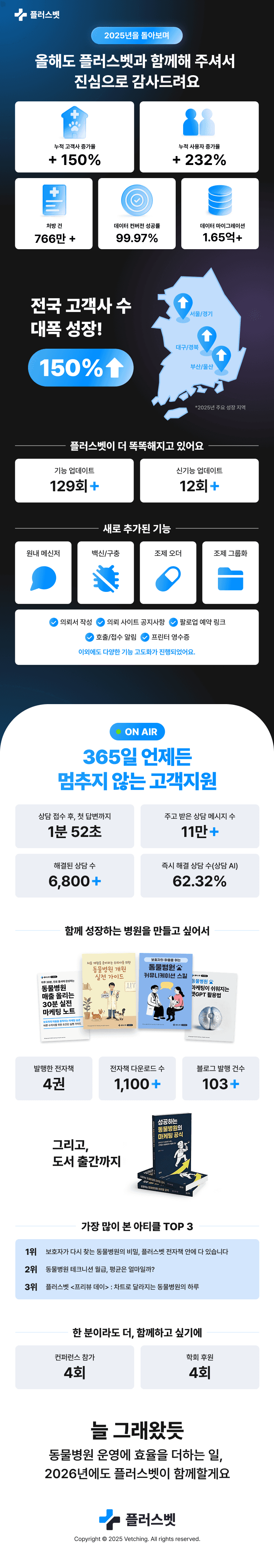 앞으로도 동물병원 현장의 목소리에 귀 기울이며, 선생님들과 함께 한 걸음씩 나아가겠습니다. 늘 함께해 주셔서 감사합니다. 2026년에는 많은 선생님들이 문의주시고 있는 ‘보호자 앱’ 런칭을 위해 바쁘게 준비하고 있습니다. 이 또한 기대해 주셔도 좋겠습니다. 편안한 연말 되시기 바랍니다.